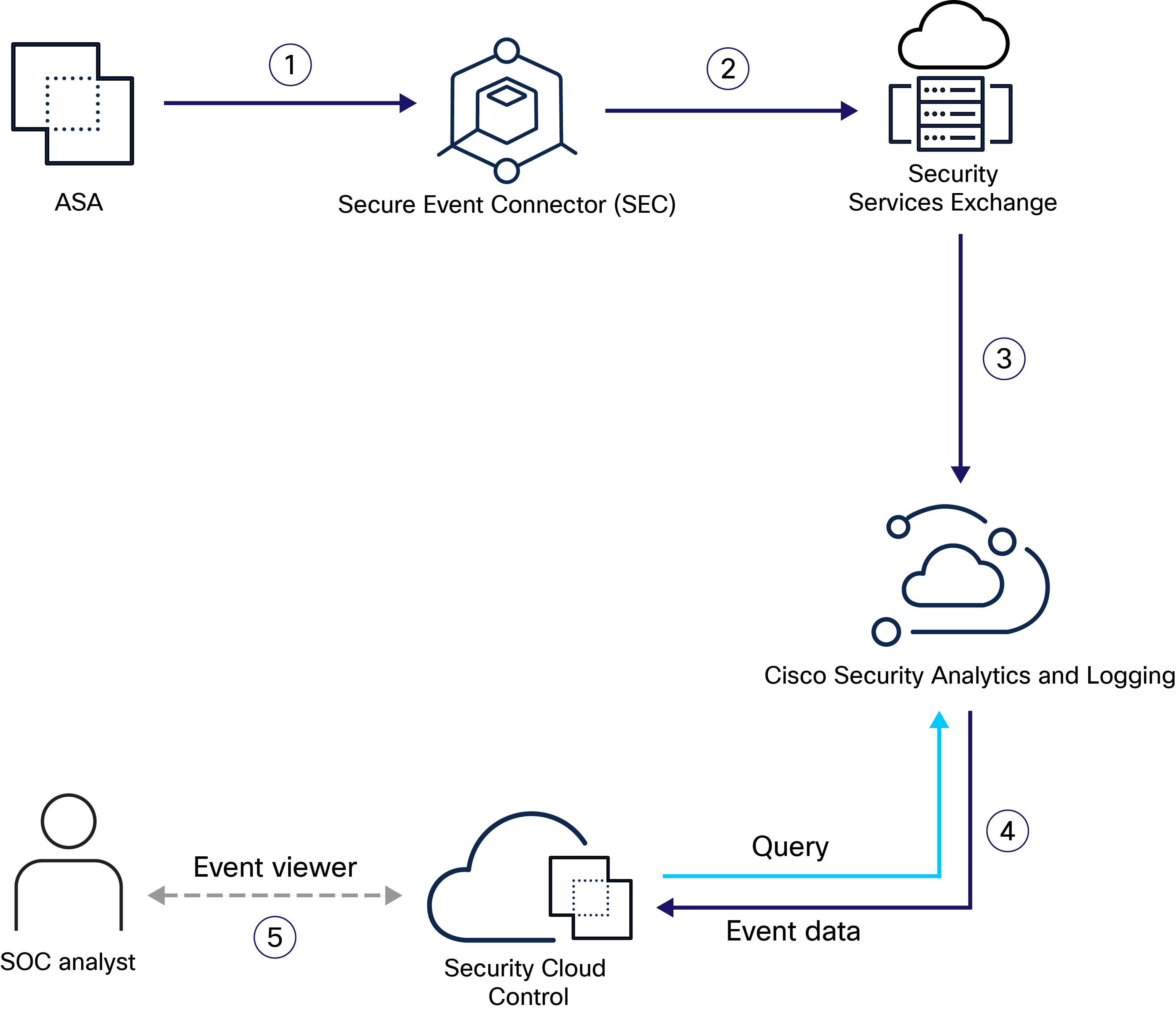 Security Services Exchange aggregates the event data from all the ASA devices, converts it to JSON format, and sends it to Security Analytics and Logging for storage. |