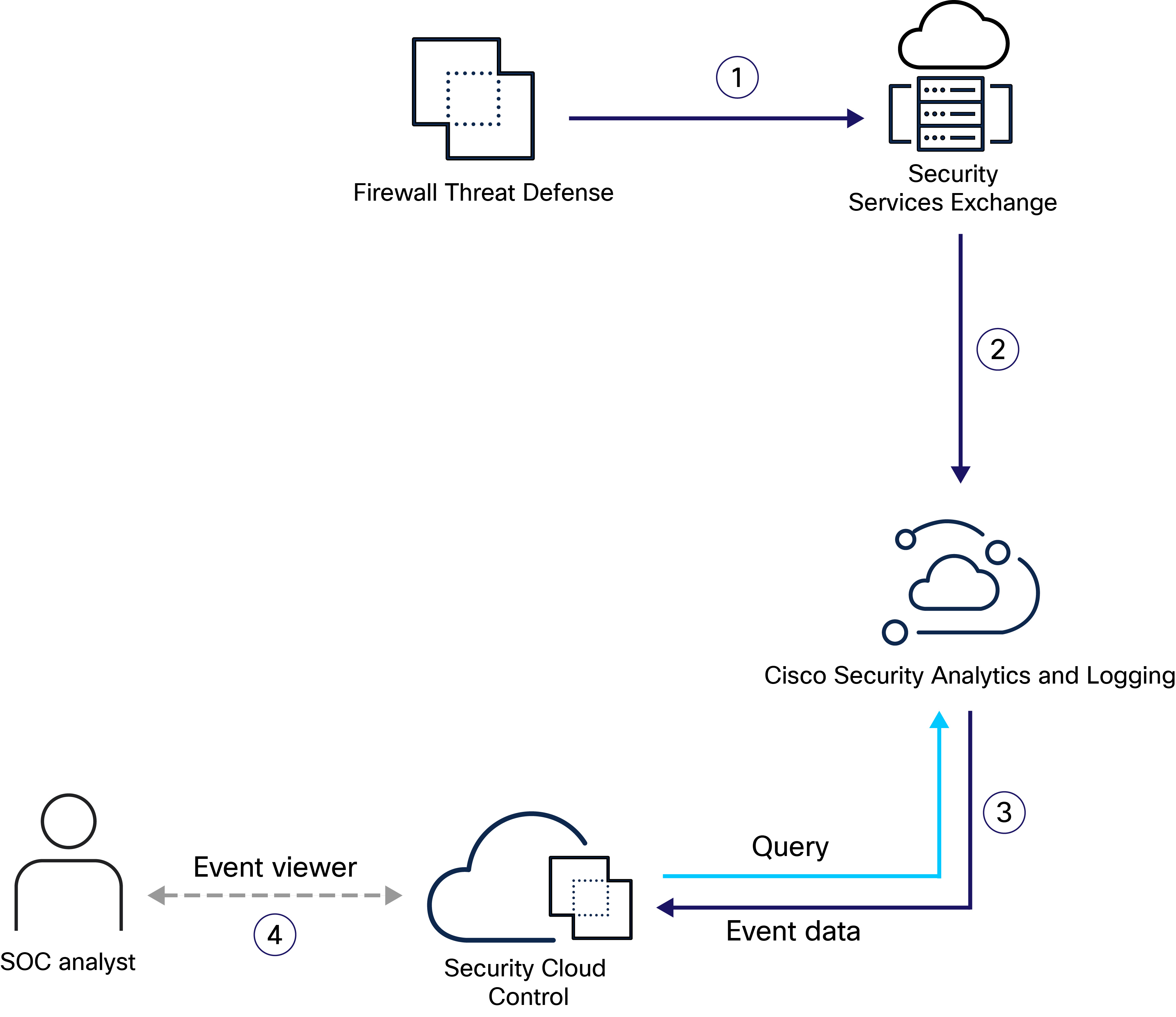 Security Analytics and Logging stores the event data in the cloud data store. Security Cloud Control Firewall Management queries the stored data to provide SOC analysts with the relevant information. |