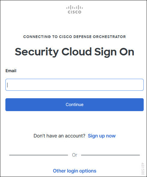 Step 4 | Log in to your Security Cloud Control account. If you do not have a security cloud sign on account to log in to Security Cloud Control and you want to create one, click Sign up now in the Security Cloud Sign On page. See Create a New Cisco Security Cloud Sign On Account. |